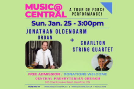 Sunday, Jan. 25th at 3 PM Jonathan Oldengarm will perform with the Charlton Sting Quartet. "Pipe Organ and Strings in Concert." Central Presbyterian Church, 165 Charlton Avenue West. Free will donations. cpchamilton.ca
