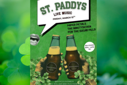 Friday March 13th, 8pm - late. Live Indie Music for St. Pat's Weekend at RIDICULOUS club on King William St. & Hughson St. N. Featuring For The Sugar Pills, Paper Petals, & The Ninety Seven. $15 cover. 19+. eventbrite.com/o/75109309393